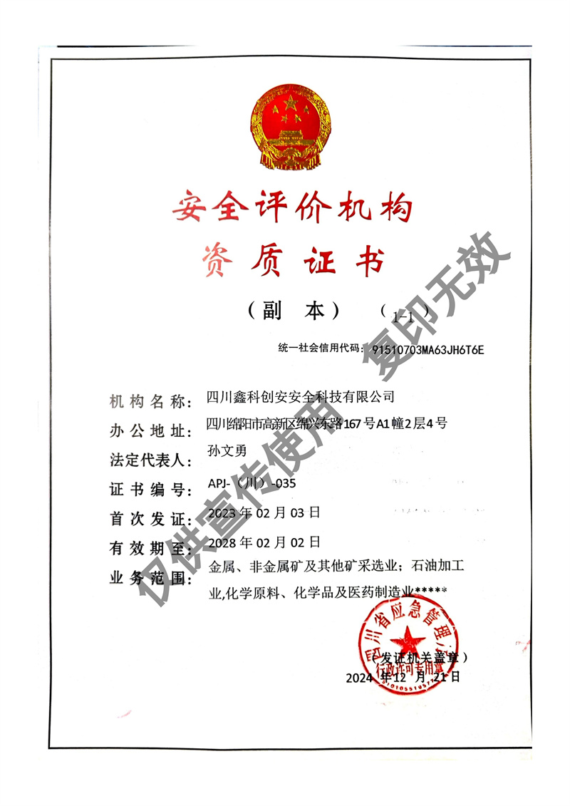 四川鑫科創(chuàng)安安全科技有限公司成立于2020年,是川北地區(qū)取得資質(zhì)的民營(yíng)安全評(píng)價(jià)機(jī)構(gòu)(資質(zhì)證書(shū)編號(hào):APJ-(川)-035)。并于2022年?duì)款^成立綜合應(yīng)急救援隊(duì)伍 - 綿陽(yáng)曙光應(yīng)急救援中心。